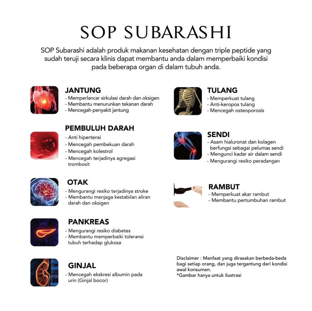 SOP Subarashi Gold merupakan produk hexa peptide di Jepang yang memiliki bahan utama yaitu Marine Placenta ikan Onchorhynchus Keta Salmon di Hokkaido, Sardine Peptide, Fruitflow (vegan peptide), Salmon Anserine Peptide, Salmon Caviar Peptide dan Tuna Heart Peptide.