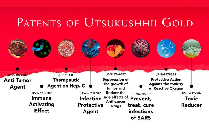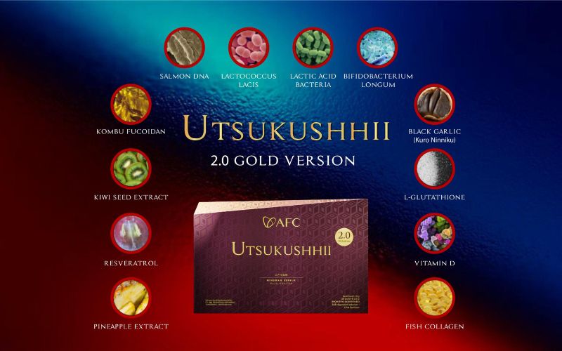 8 Bahan utamanya antara lain : Salmon DNA, Takara Combu Fucoidan, Triple Probiotik, Bawang Hitam, Extrak Nanas, Ekstrak Kulit Anggur, Ektrak Biji Kiwi, Vitamin D dan lain lain. Utsukushhii Gold memiliki 8 paten manfaat seperti yang tertera di bawah ini :